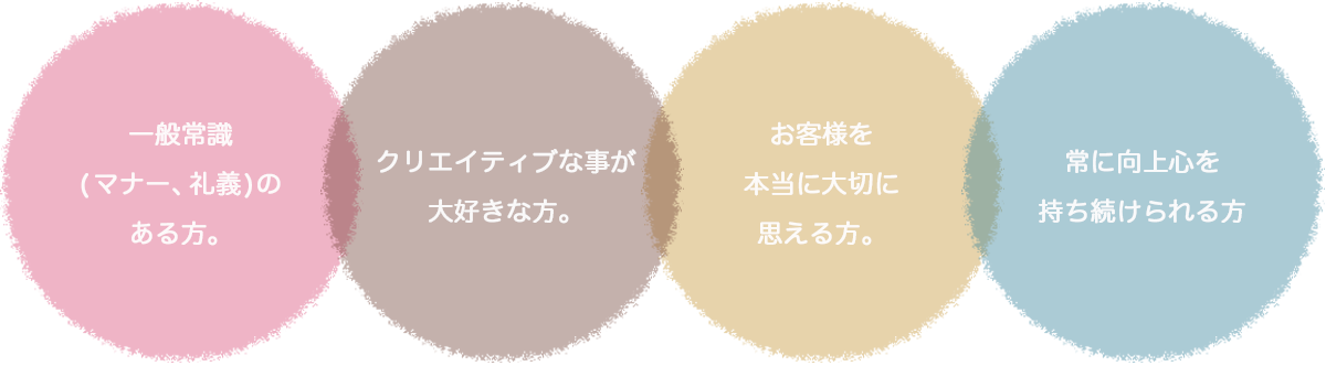 美容師としての資質、感覚、意欲そして何より美容が大好きであることを重視します。アシスタントの方はしっかりとした美容の技術・知識をつけどこに行っても恥ずかしくないスタイリストになれるよう徹底的なサポートをお約束します。体育会系なノリは一切ありません。スタイリストの方は美容の技術・知識以外にも、販促活動や企画の立て方など普遍的に商売に役立つスキルを余すところなく伝授します。将来独立開業したいという方には特に役立ちます。